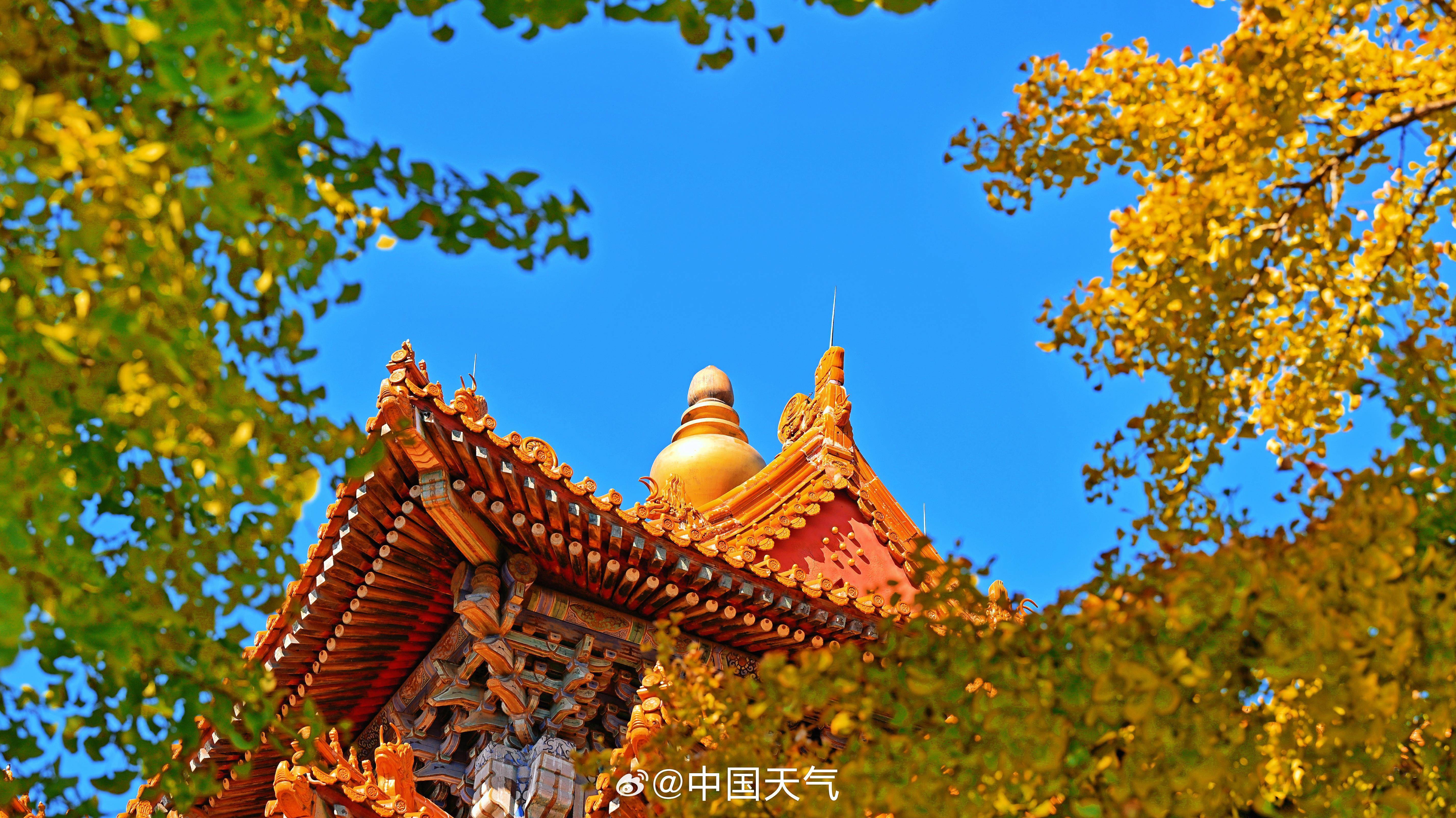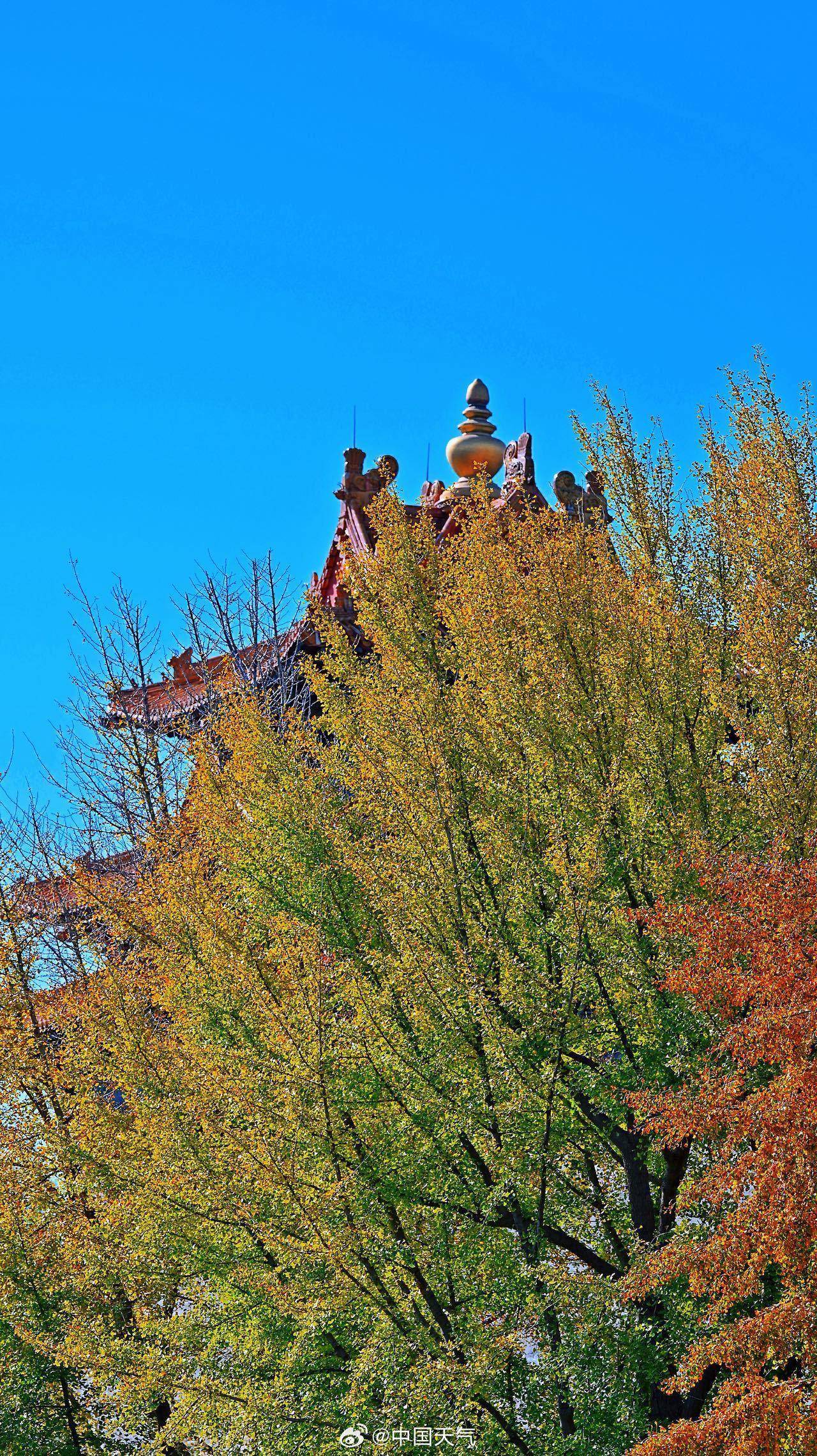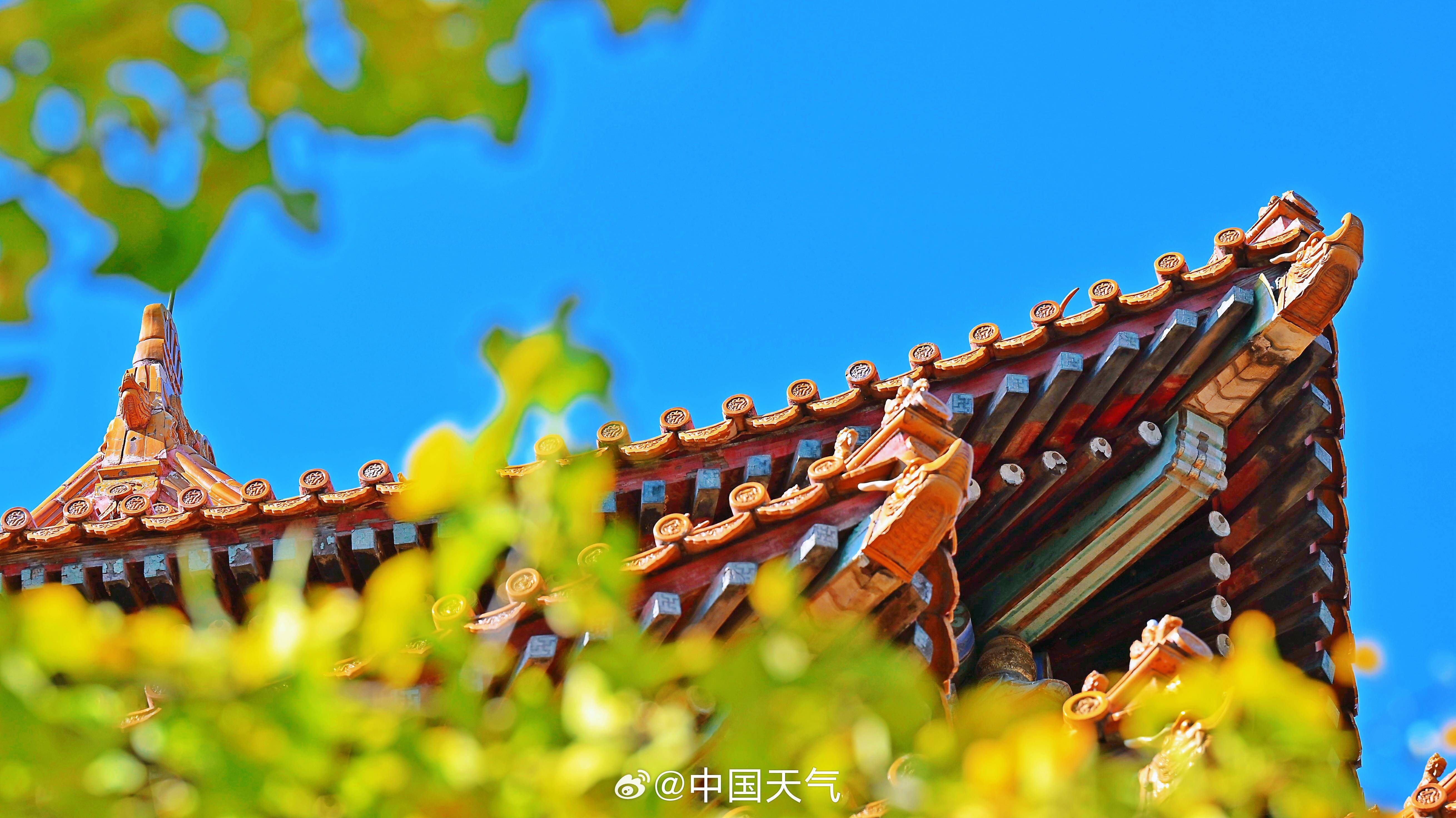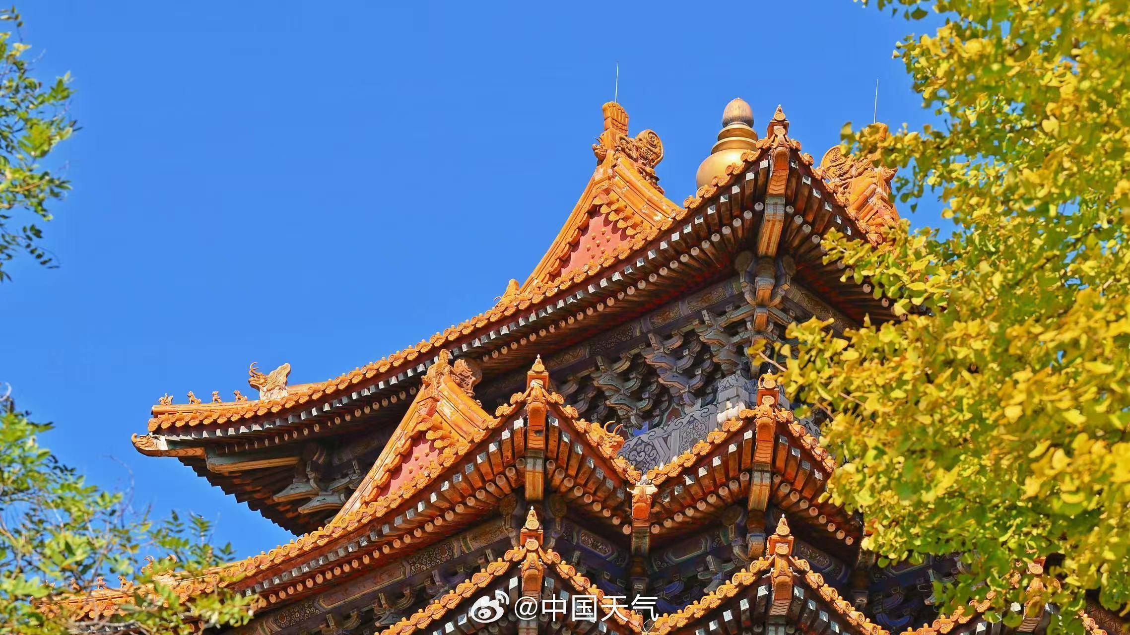 今天(21日),北京天空湛蓝纯净,故宫角楼的飞檐翘角与秋叶相得益彰,尽显古典之美。(来源:中国天气网)