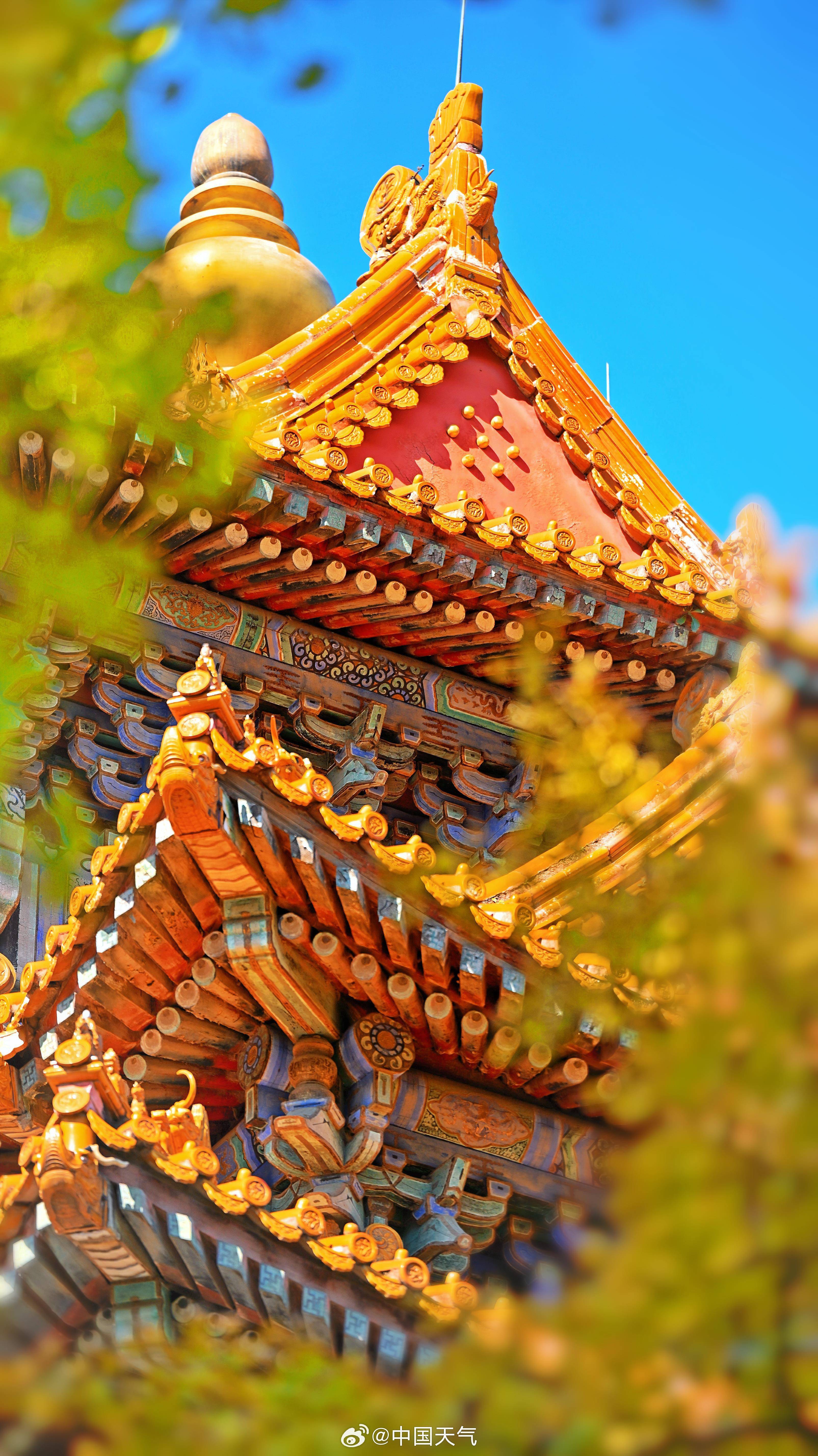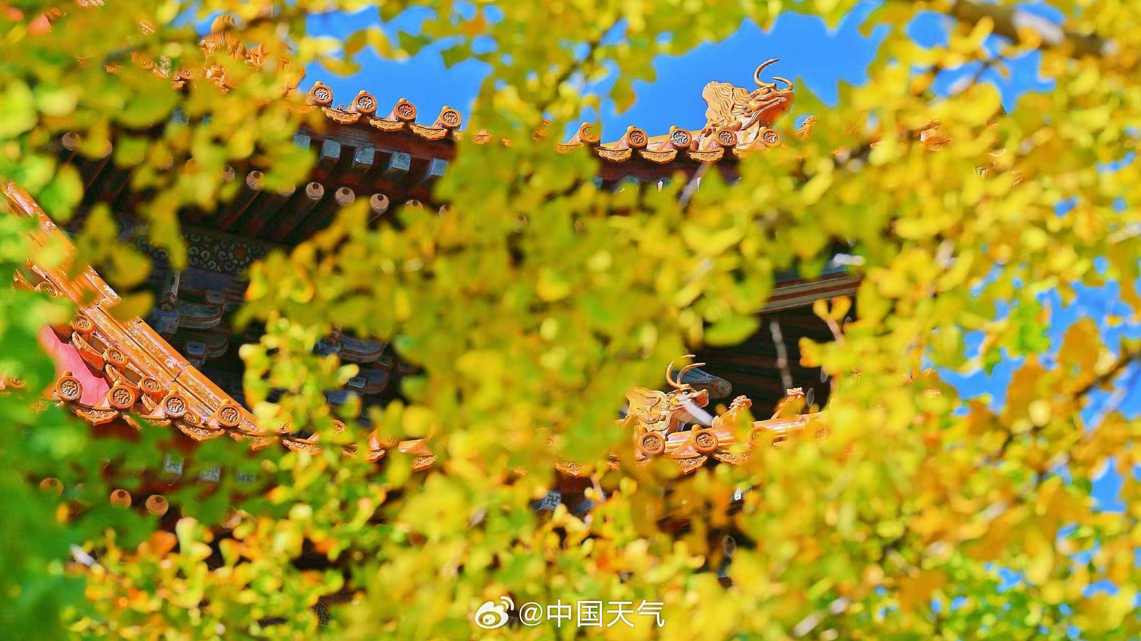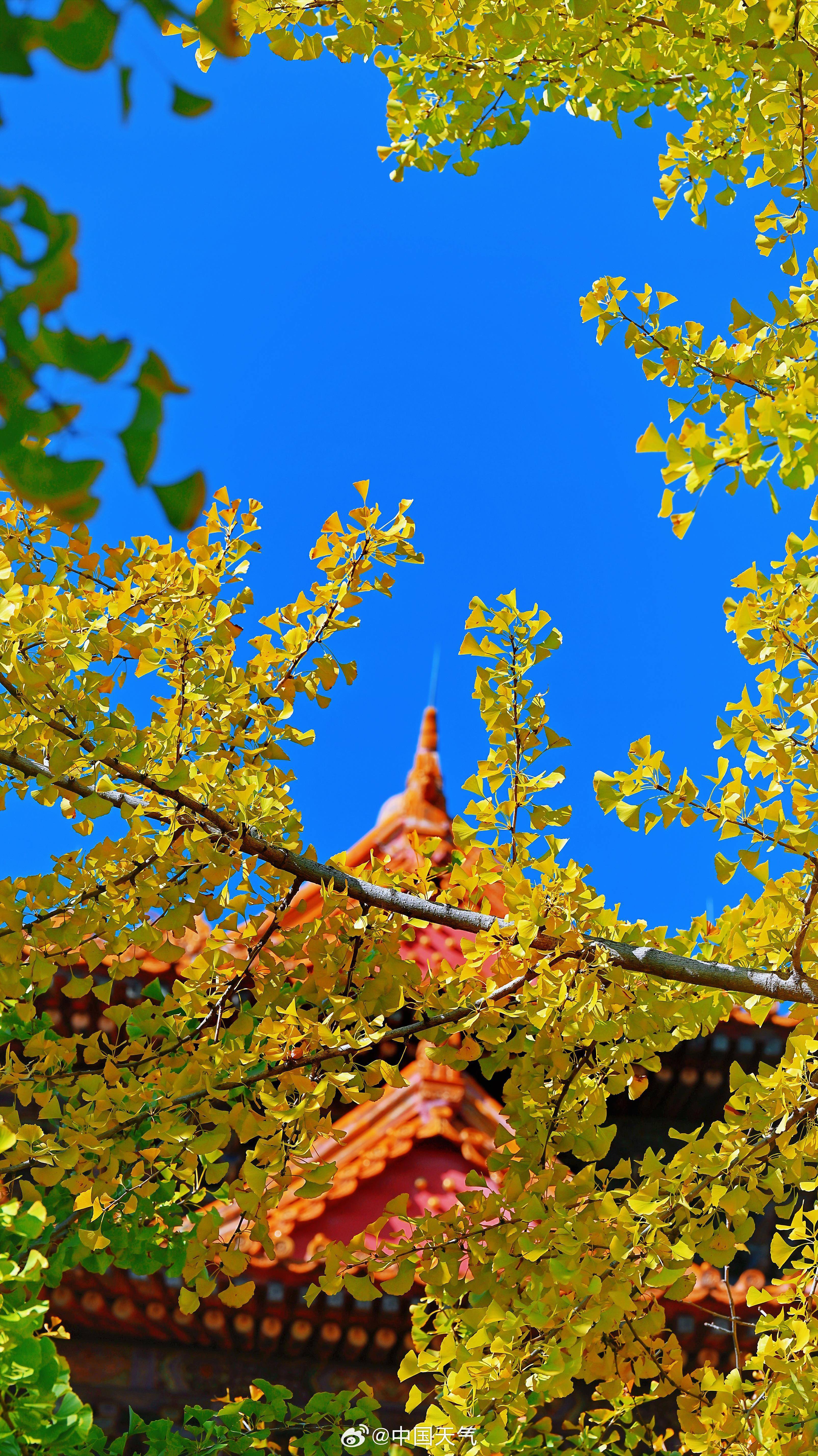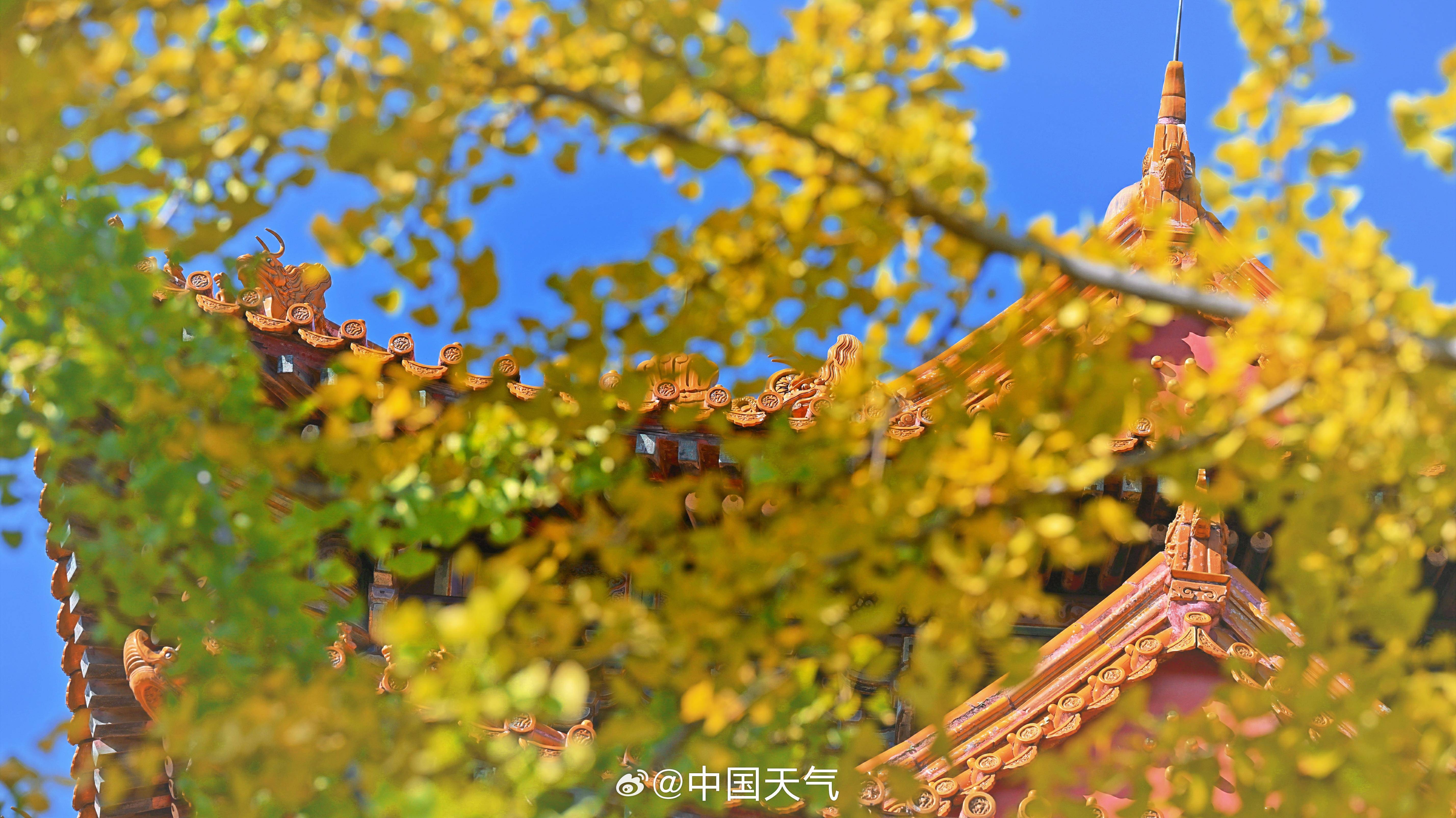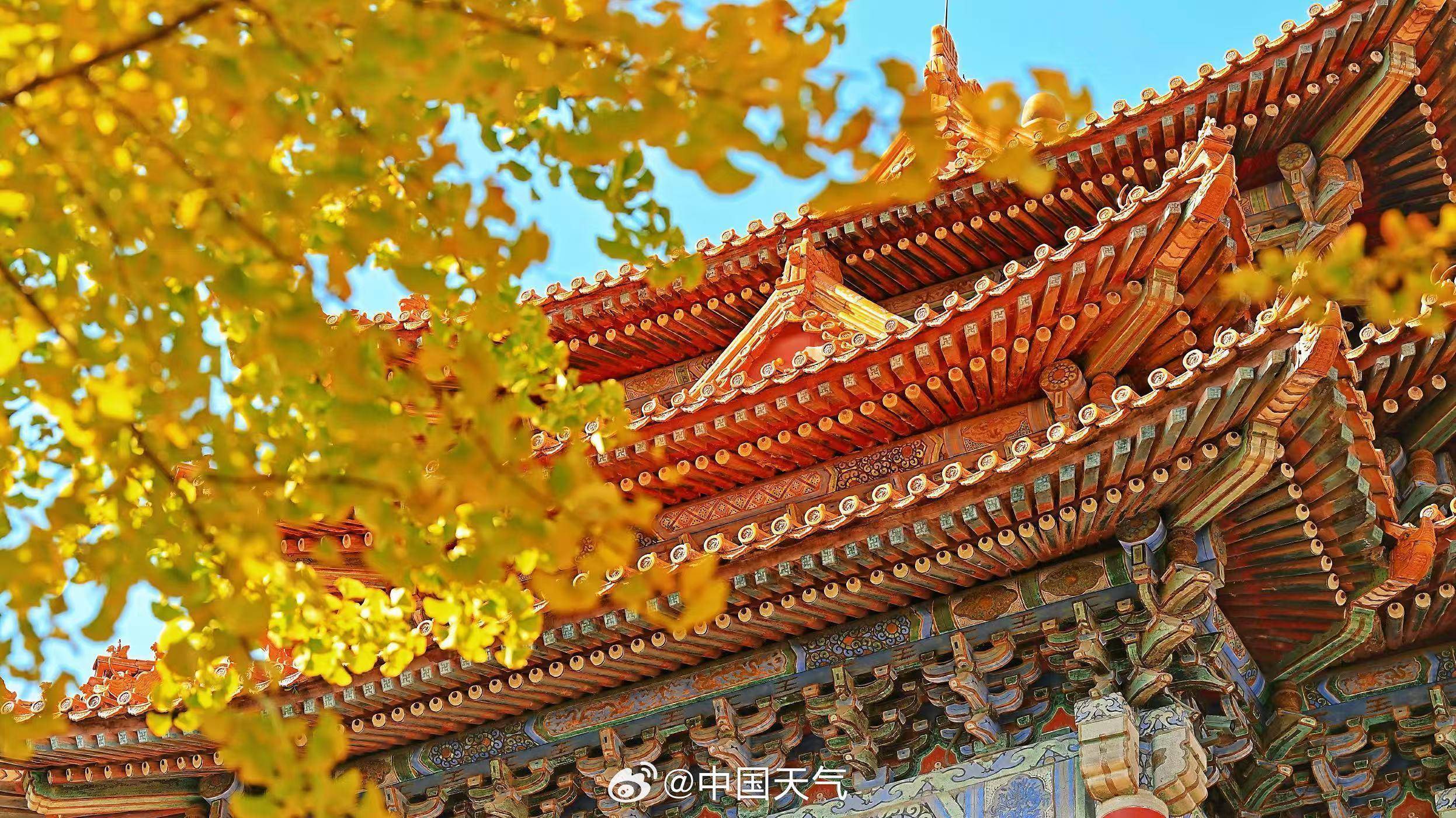 今天(21日),北京天空湛蓝纯净,故宫角楼的飞檐翘角与秋叶相得益彰,尽显古典之美。(来源:中国天气网)